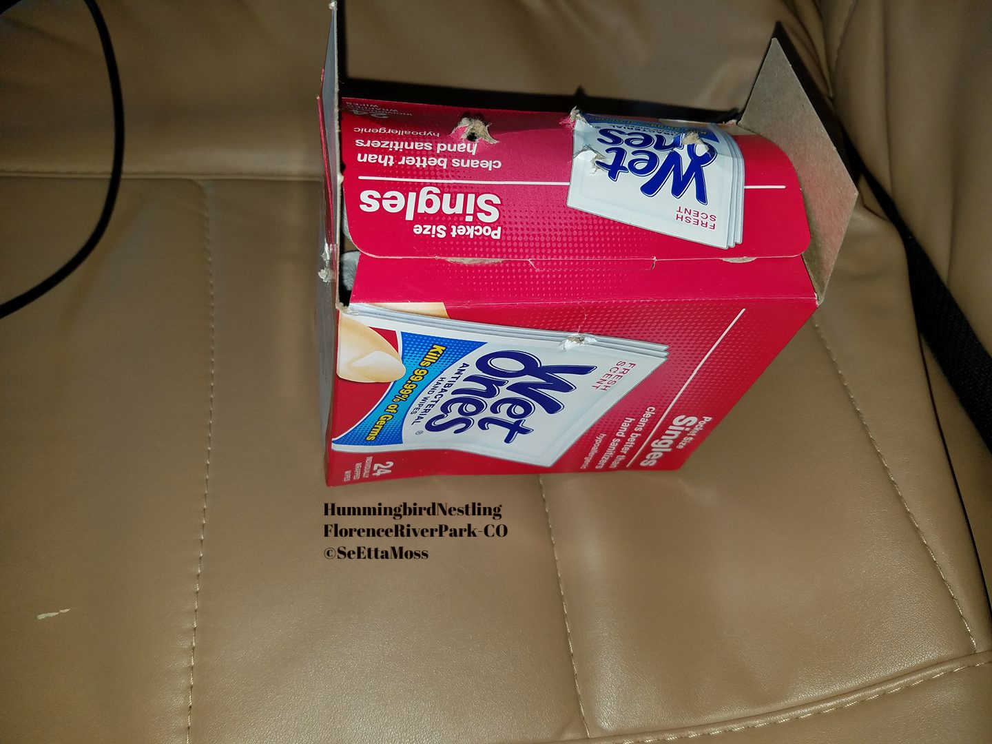 The nice thing about baby hummers is they don't need very large transport boxes. The pic below is the box I put holes in then put it in my car for just under an hour drive to Pueblo. It chirped every few seconds for most of the trip which apparently was it's calling to be fed. I did get it to the rehab in Pueblo. Nancy confirmed it was a very young bird, maybe a week or so old.
